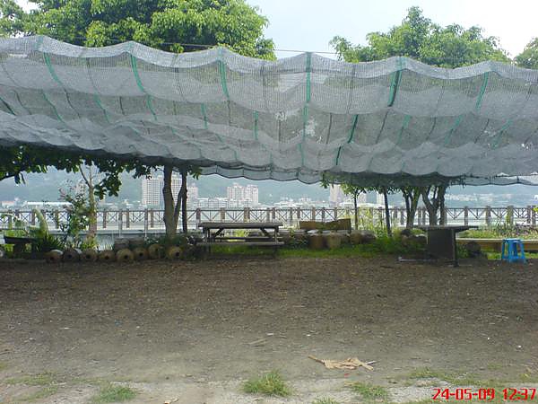 " " 型石板路的另一邊有好像絲瓜棚架的東西,往外看可以看到淡水河濱自行車道(很近)。