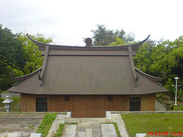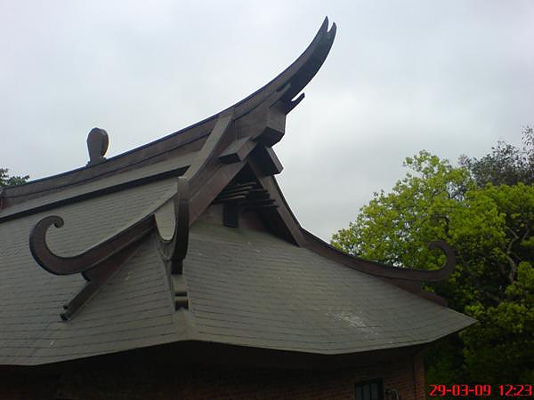拜殿四面加砌磚牆開窗,原木桁樑屋架外側,改成中國傳統建築閩南式燕尾翹脊屋頂包覆,